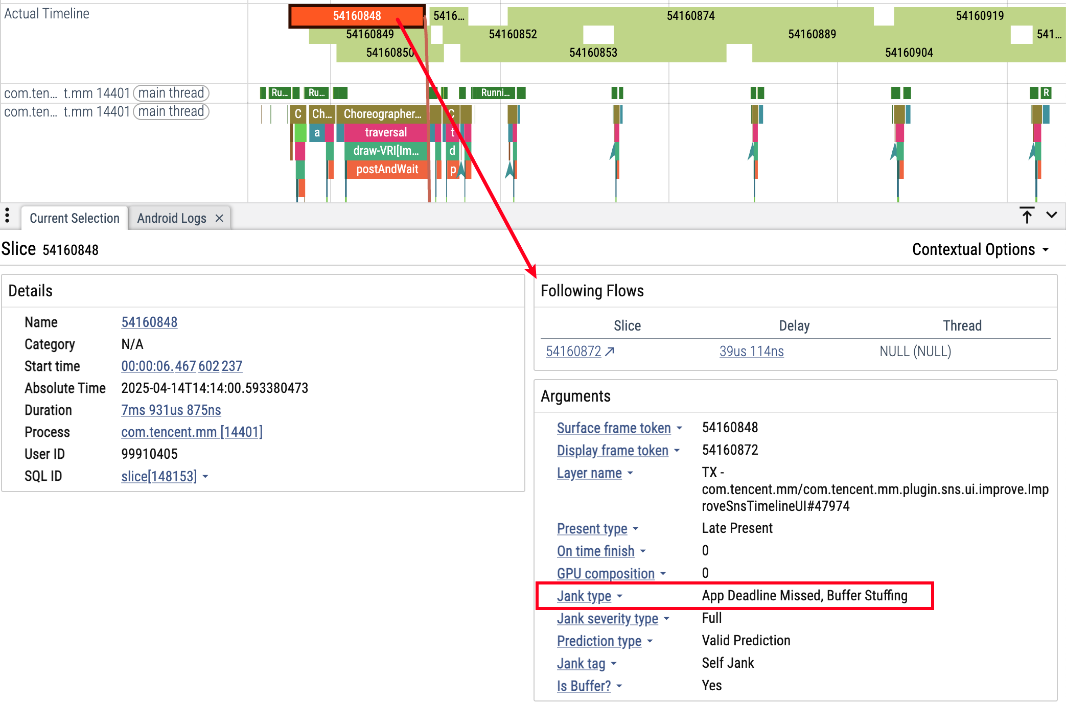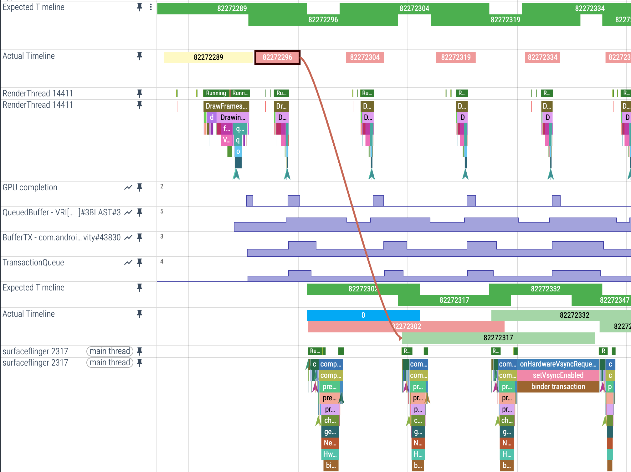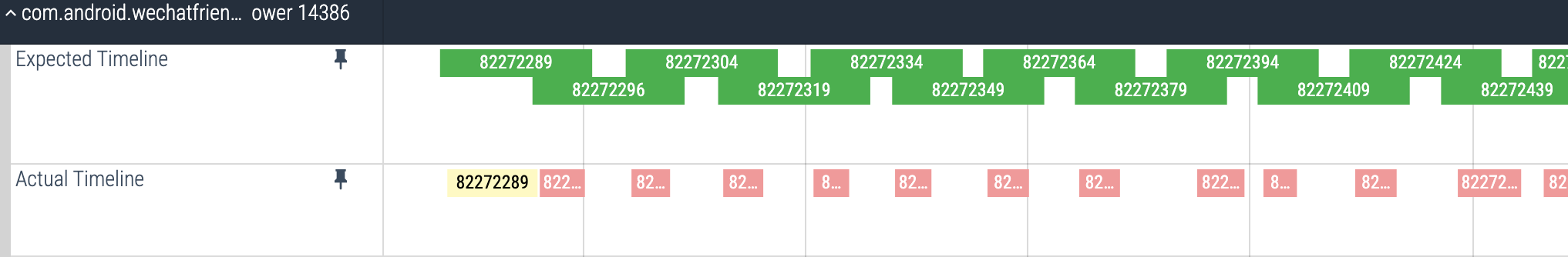 根据 Perfetto 官方文档,当帧在屏幕上的实际呈现时间与调度器预期的呈现时间不匹配时,就会产生卡顿。FrameTimeline 为每个有帧在屏幕上显示的应用添加了两个新的轨道: